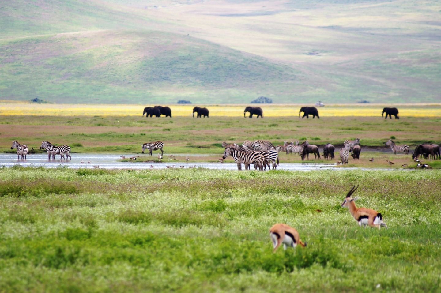 The huge crater floor is spotted with large herds of zebras, wildebeests, elands, Grant’s and Thompson’s gazelles. As we get closer to the game, lions can be seen as well as the occasional herd of elephants and the endangered Black Rhino. Rare species like serval cats, hyenas, jackals, and cheetahs may be spotted, and your guide will help you adjust your eyes to watching game and looking for behaviors that may indicate if predators are around.